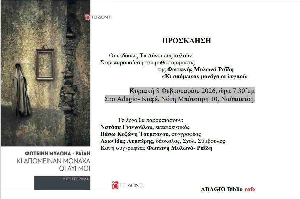06/02/2026Την Κυριακή 08/02/2026 στις 7:30 το απόγευμα στο βιβλιοπωλείο-καφέ Adagio II στη Ναύπακτο παρουσιάζουμε το μυθιστόρημα της Φωτεινής Μυλωνά – Ραΐδη…